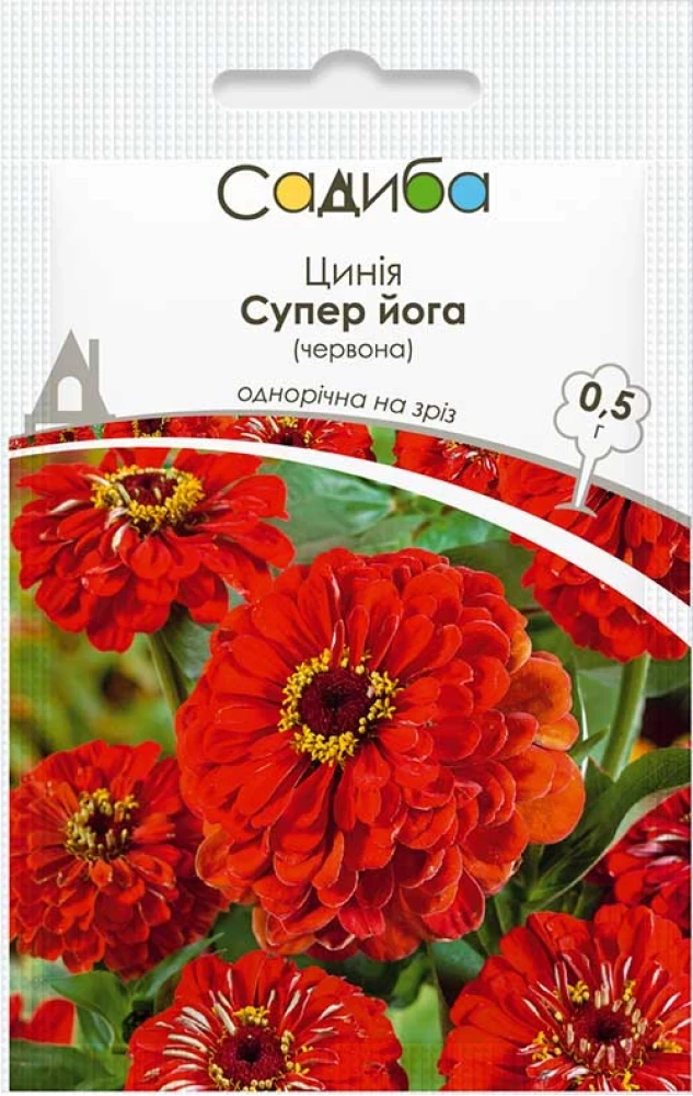 Цинія Супер йога, червона – вишукана рослина до 90см висотою, з сильними стеблами, які майже не галузяться, та великими, наповненими, насичено-червоними квітами діаметром 6-10см – стане улюбленицею у вашому домі, адже сорт виведений спеціально для використання на зріз. На розсаду насіння висівають в середині квітня, пересаджуючи її у відкритий ґрунт у травні – на початку червня. В цей же час можна висівати насіння і безпосередньо у відкритий ґрунт на глибину 0,5-1см. Ця сонцелюбна та теплолюбна квітка зацвіте вже через 2,5 місяці після висіву і буде буяти аж до осені. Окрім того, яскраво виглядає у квітниках та бордюрах.