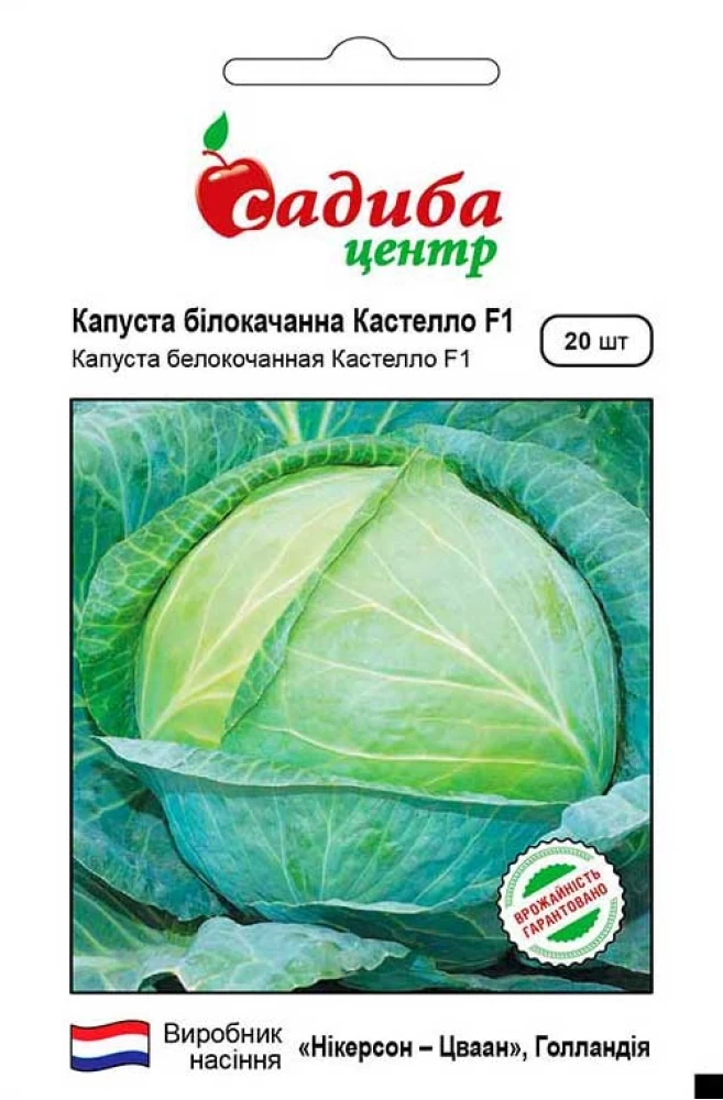 Капуста Кастелло F1 – визнаний одним з кращих гібридів середньостиглої капусти. Вегетаційний період – 80 днів. Качани круглі, щільні, високих товарних якостей, масою 2,0-2,5 кг, довго зберігаються в полі, не переростають. Універсальний за термінами вирощування, можливо конвеєрне отримання продукції протягом всього сезону. Дуже висока стійкість до розтріскування.