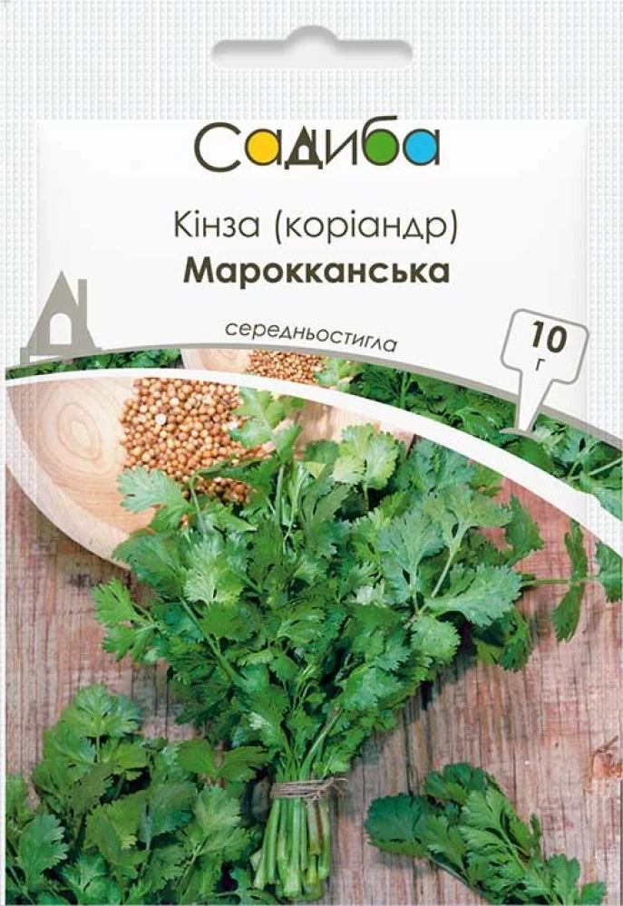 Кінза Марокканська – середньостиглий (40-60 днів) крупнонасінний сорт пряної зелені для відкритого і закритого ґрунту. На ароматних соковитих стеблах, висотою до 70 см, виростає багато яскравого запашного насичено-зеленого листя, а пізніше – крупного насіння (в 1 г – 65 насінин). Сорт цінується за високу врожайність, якісну зелень, посухостійкість. Не має схильності до стрілкування. Зелень добре підходить для споживання в сирому вигляді, вишукано доповнюючи смак смаженого м’яса або овочів, добре зберігається в замороженому й сушеному вигляді.