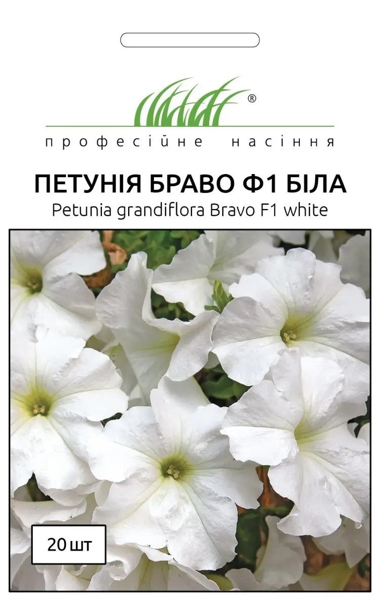 Петунія Браво F1, біла – нова великоквіткова петунія з хвилястими, бахромчатими квітами. Рослини гіллясті, стійкі, добре і пишно зростаючі, кущики досягають висоти 35 см. Квітки білосніжні, великі, діаметром 8-9 см. Посів проводять з лютого по березень. Сходи з'являються через 7-12 днів. На постійне місце висаджують, коли мине небезпека приморозків. Цвітуть рясно, з кінця травня весь сезон. Світлолюбна і досить посухостійка рослина. Її можна успішно вирощувати навіть за несприятливих кліматичних умов. Використовують для прикраси клумб, низькорослих бордюрів, вазонів, підвіконня. При посадці в балконні ящики рослини утворюють невеликий каскад.