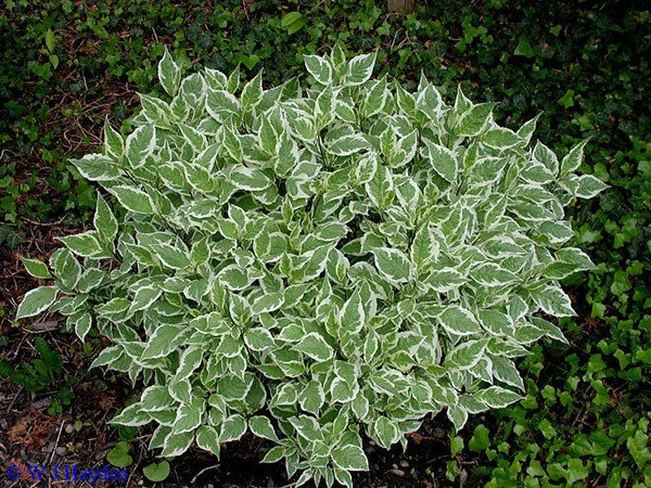 Сорт дуже декоративний в зимовий час. Листя великі, темно-зелені, по краю зі світлою облямівкою. Осіннє забарвлення листя має фіолетово – пурпурні або червоні тони, облямівка по краю залишається світлою.