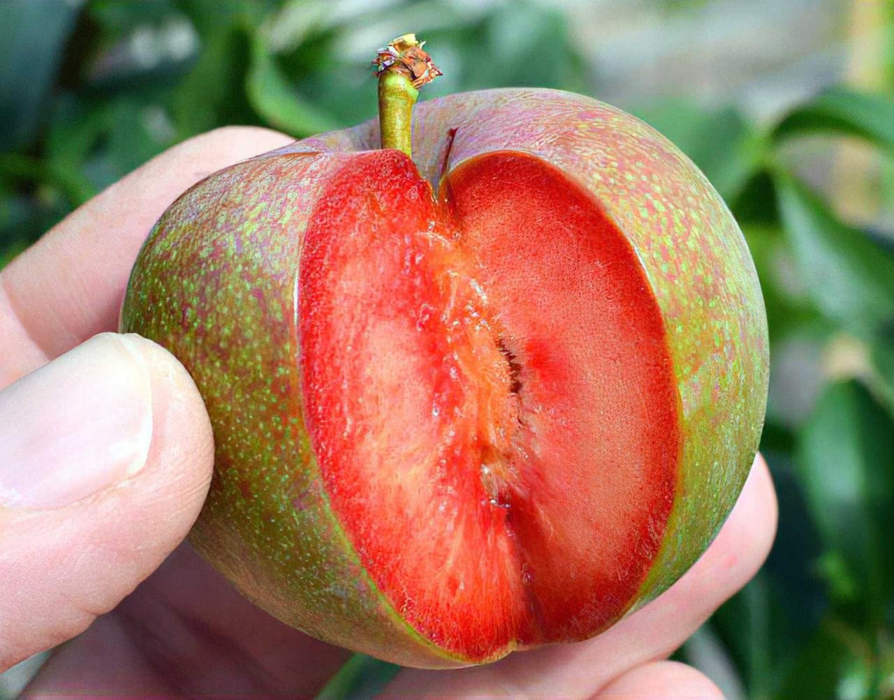 • Зовнішній вигляд, смакові властивості: Плоди округлі, з зеленувато-червонуватою шкіркою з червоним мармуровим візерунком; м’якоть яскраво-червона, соковита, дуже солодка з приємним ароматом, високих десертних якостей