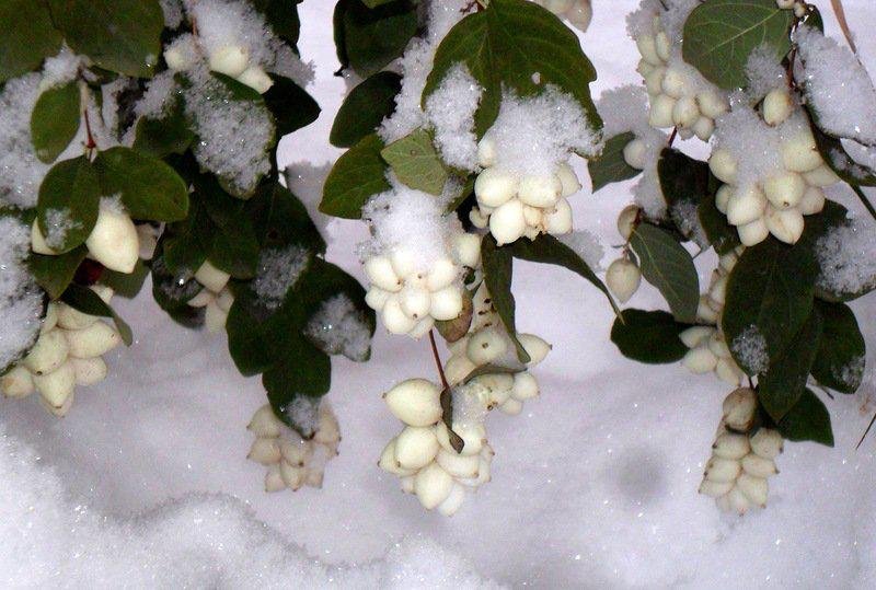 Ягоди білі, округло – овальні, не отруйні, зберігаються на кущі до пізньої осені і навіть взимку.