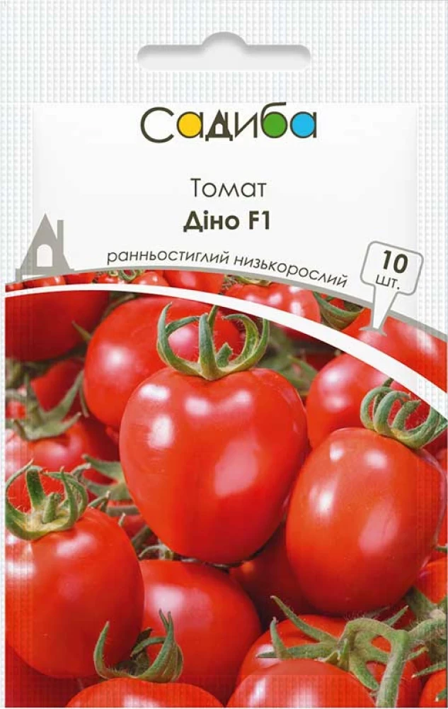 Томат Діно F1 – ранньостиглий (95-105 днів), високоврожайний, низькорослий (біля 100 см) гібрид типу сливка для вирощування у відкритому ґрунті. Рослина міцна, збалансована, до 8 пагонів. Плоди насичено-червоні овально-видовженої форми, масою 130-150 г, м'ясистої структури, з високим вмістом сухих речовин, легко знімаються з куща завдяки колінцю, вирівняні за формою і розміром, на 98% достигають на кущі. Забезпечує стабільний врожай в різних умовах вирощування, стійкий до захворювань, не втрачає товарних якостей при зберіганні і транспортуванні. Ідеальний варіант для свіжого ринку.